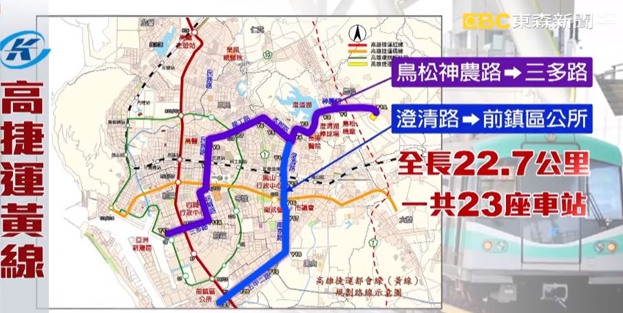 高雄捷運黃線從104年12月開始規劃,起於鳥松神農路經過大埤路等路段到市區三多路,另外一條則是從澄清路出發至前鎮區公所,全長22.7公里,一共23座車站,經過三民區、新興甚至到鳳山區等,人口稠密,預估影響一百多萬人,總經費1438億元,2019年8月動工,希望在2028年完工。