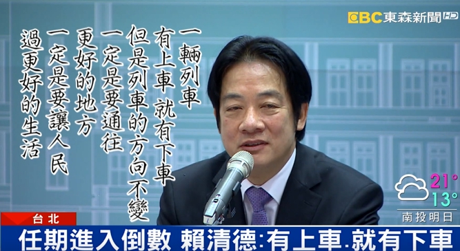 行政院長賴清德:「一輛列車,有上車,就有下車,但是列車的方向不變,一定是要通往更好的地方,一定是要讓人民過更好的生活,我適當的時間會跟大家說明。」