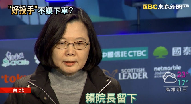 總統蔡英文:「賴院長是個好投手,我的想法同時也是我們黨內的共識,希望我們的賴院長可以繼續的領導我們行政團隊,我們也非常希望在這個最困難的時候,賴院長留下來跟我們一起努力。」