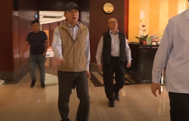 只說了一句話就上車,8點46分進了市長室,到9點16分開市政會議,韓國瑜針對敏感性問題避談。