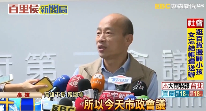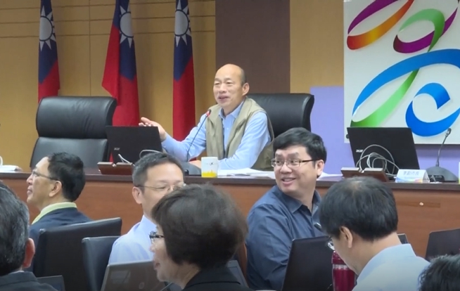 高雄市長韓國瑜:「大姑娘進洞房頭一遭,有點緊張、有點新鮮、有點好奇、有點陌生,不過慢慢慢慢磨合,我們看一些資料,但是現場大家很多都包括一些區長,過去都沒有真正共事過,所以今天市政會議我覺得大家局處長,大家都蠻開心的。」