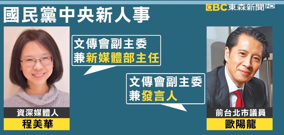 2日上午先後證實消息,尷尬的是,下午的中常會,完全沒討論這項人事案,周錫瑋原定的記者會也臨時取消,但吳敦義的算盤不只如此,邀請中生代和青壯派進入黨中央,帶來新氣象,由資深媒體人程美華和前台北市議員歐陽龍,出任文傳會副主委,其中歐陽龍還兼任發言人,但這個位置,原先要留給美女立委許淑華。