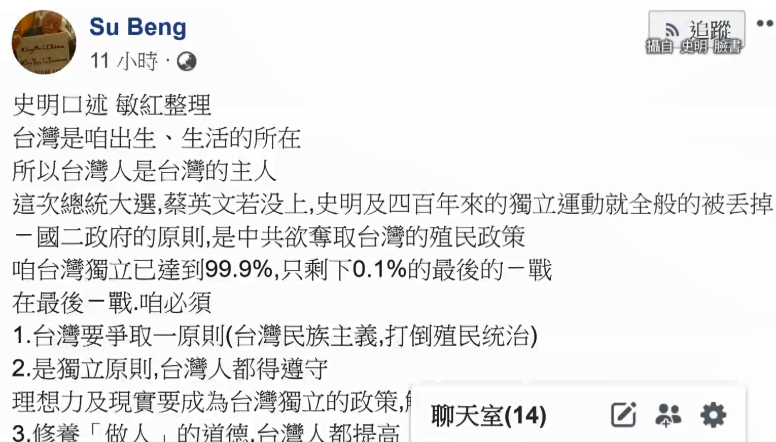 另一名台獨大老史明,也在網路上發表意見,點出3項原則,呼籲大家選舉都要支持蔡英文,否則她的失敗更是獨立運動的大失敗,逼宮事件,似乎反讓蔡英文的聲勢止跌回升。