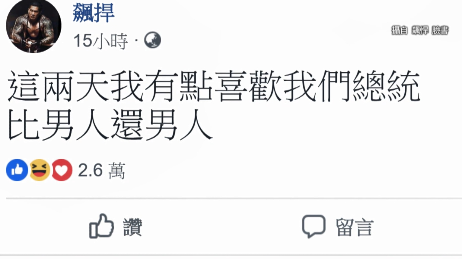 蔡英文不論面對黨內還是大陸壓力,堅強的態度,連館長陳之漢都大力稱讚,在網路發文說,這2天有點喜歡我們總統,比男人還男人。