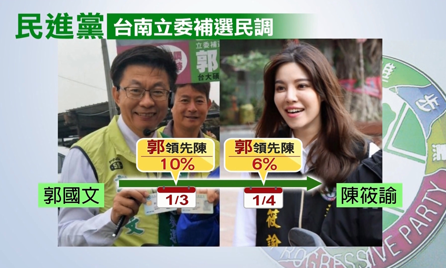 台南市長黃偉哲空出的立委職缺,民進黨內進行初選,一個老將郭國文,另一個則是政二代的陳筱諭,但是初選2份民調,郭國文的支持度都高於陳筱諭而勝出。