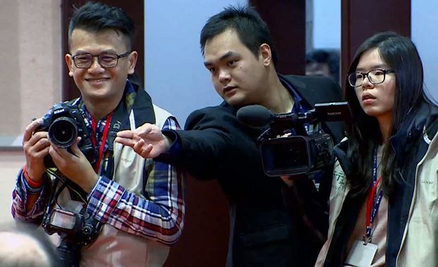 原本還在交代攝影師,要怎麼取景,看到熟識的蘇夫人經過,馬上熱情打招呼,左邊拿單眼的戴帽男,負責靜態影像,右邊的黑框女,負責動態紀錄,中間穿西裝的是蘇貞昌的小編。