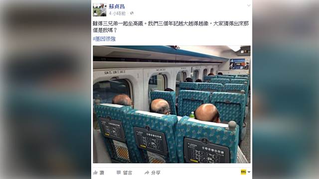 電火球」,蘇貞昌在臉書中說:「難得三兄弟一起坐高鐵。我們三個年紀越大越得越像,大家猜得出來那個是我嗎?」