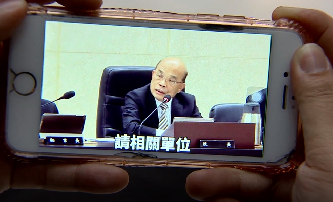 東森新聞記者張良晧:「字體壓在臉上,蘇貞昌不在意,關鍵就在他觀察到,有不少民眾使用手機時,並不會把耳機掛上。」