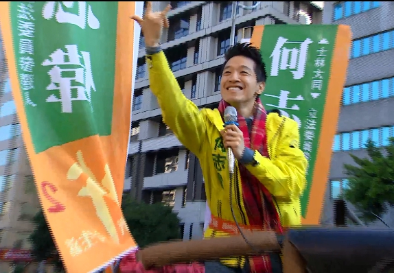 站上吉普車向支持者謝票,剛從立委補選拿下勝利的何志偉,心情看起來相當不錯,但前一天勝選時的這段激烈發言,挑起對手的隔空交火。