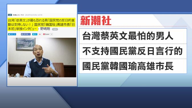 另外日本媒體新潮社,更是以蔡英文最怕的男人來形容韓國瑜,說他不支持國民黨的反日言行,日本新潮社記者更認為,這個很不國民黨的韓國瑜,能颳起旋風,正如韓國瑜自己在競選時說的,是台灣民眾對現狀不滿。