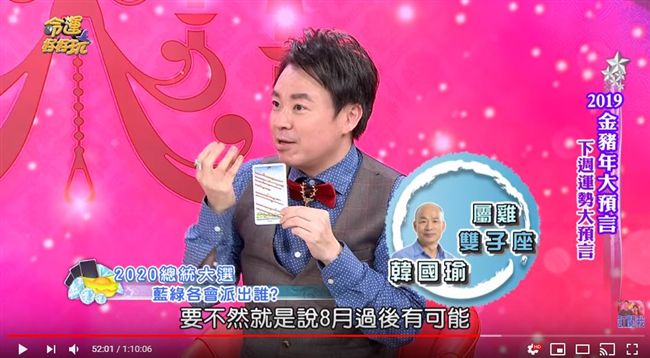 韓國瑜成功翻轉高雄,許多支持者要他一舉挑戰2020總統大位。《命運好好玩》日前邀請小孟老師以抽塔羅牌方式,替韓國瑜預測2019年運勢,抽出來的牌為「權杖八」,小孟老師表示,這張牌代表的是現階段韓國瑜的支持度仍高,但他大膽推測,這波韓流恐怕只能維持到8月。小孟老師接著表示,6、7、8這3個月內,南部可能會有天災的發生,最好做好防洪措施,「或者8月他(指韓國瑜)會有一些失言,或是他沒有做出一些很大、很具體的貢獻,恐怕就會被爭議」,此外,他也預測民意會拱韓國瑜出來做一些事,但他應該不會出來,「他也怕別人覺得他只是出來亂一亂,他會把市長做好」。