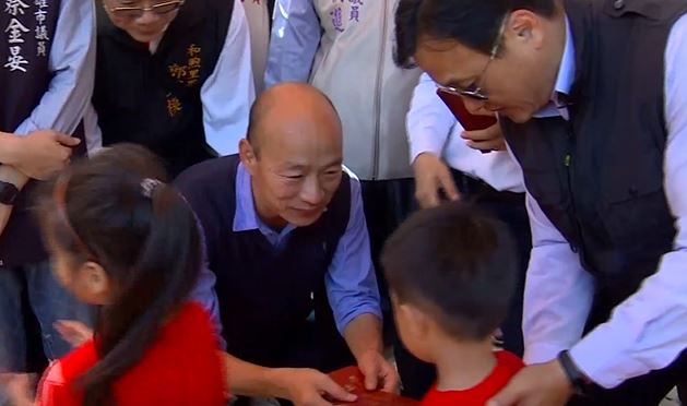 到前金區萬興宮發紅包、拜晚年韓國瑜還是高人氣,艷陽天他不厭其煩必定彎腰雙手遞上,再給個熱情微笑,看到小朋友一定蹲下來。