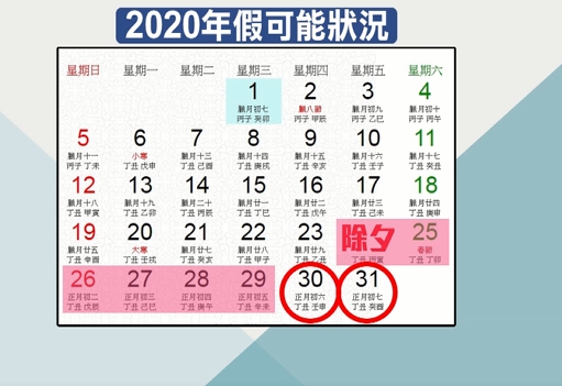 如果沒有調整,那麼原本是從除夕1月24日開始休假,因為跨了六日,所以會補假到初五29日,前後一共休6天,而如果要往後休滿9天,可以彈性多休30跟31日,連接2月1日周六,但這樣2月2日周日就可能要上班,或者提前在除夕前一天,23日就休假,休到31日 ,同樣是連9天,但這下就必須挪移三個工作天,對民眾來說未必方便。