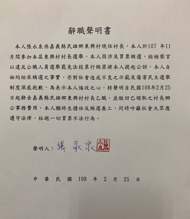 嘉義縣民雄鄉東興村長張永泉因涉及賄選遭起訴,且被提起當選無效之訴,他今天透過律師發表聲明,為了不要浪費司法資源,將於25日辭職,且願終生擔任反賄選義工。