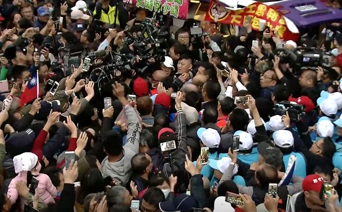 韓國瑜北上三重,要為立委補選替鄭世維站台,座車一抵達立刻被媒體、韓粉團團包圍。