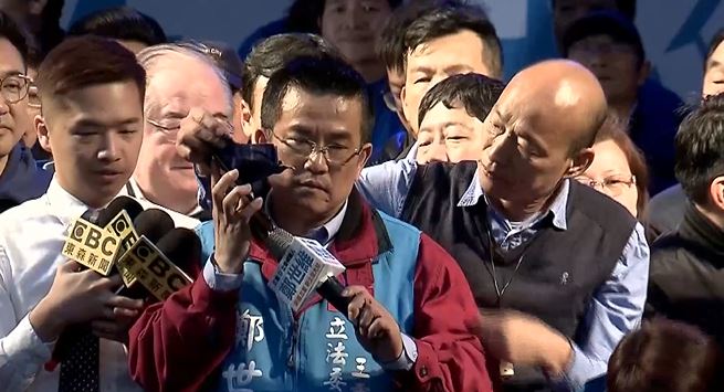 對著韓國瑜高喊總統好,造勢現場一度飄起小雨,中途跟侯友宜通電話,韓國瑜還貼心拿出手帕,幫忙擋住手機遮雨,不忘幽默本性大開玩笑。
