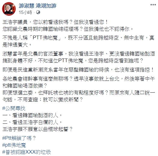 而面對王浩宇的指控,游淑慧也透過臉書回擊,指出自己當時是北農的官派董事,但從沒看過王浩宇,更沒看過韓國瑜因酗酒搞到身體不好,反問:「不知道這位PTT佛地魔,您是跨越時空看到誰呢?」更狠酸:「王浩宇議員,您以前看過我嗎?但我沒看過您!您認識北農時期的韓國瑜總經理嗎?但我猜他也不認得你。」