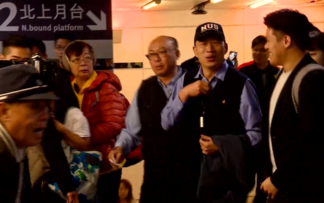 韓國瑜快閃台北四小時,離開前在等著買車票,粉絲意外得到機會和他合照,激動的大喊。
