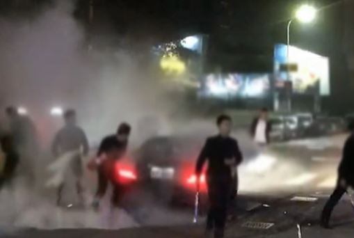 ▼台中夜店爆發鬥毆事件,好幾名黑衣男子拿著棍棒就往賓士車猛砸,還有人跳上車子甚至跑去砸店。囂張行徑完全不把警方放在眼裡。(圖/東森新聞)