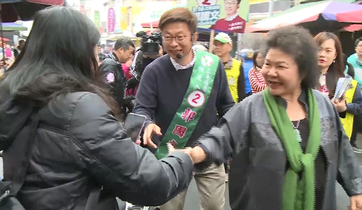 陳菊緊緊跟在郭國文一旁,從市場拜票到廟裡參拜,看到人就推薦郭國文,陳菊搶攻女性選票,說這一票必須團結才能過關,郭國文也說,對手複製韓流方式,但他才是最關心勞工的人。