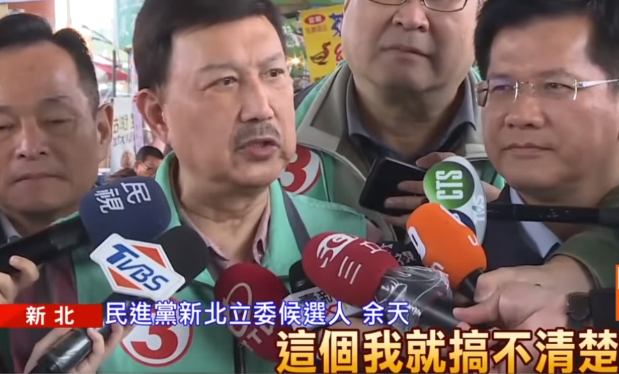 民進黨新北立委候選人余天:「這個我就搞不清楚,不曉得是侯友宜在選,還是韓國瑜在選,這個肖像權有沒有問過他們,我也不知道,我不曉得選委會為什麼這樣,搞不清楚。」