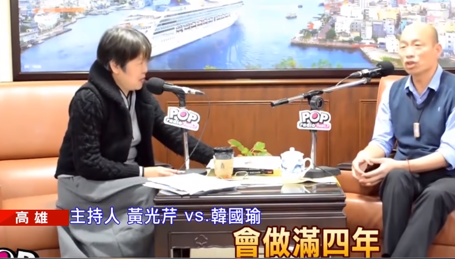 主持人黃光芹vs.韓國瑜:「(主持人:你認為你高雄市長,你說你大概要做到什麼時候)我現在沒有2020總統大選,完全不在我的考量之內,這是我一貫的說法,而且我再重申一遍,我現在最關鍵就是讓高雄市衝起來,這應該不是問題,繼續完成,我4年任期會做滿4年,我繼續做,現在不在我考量。」