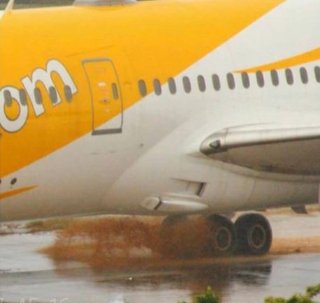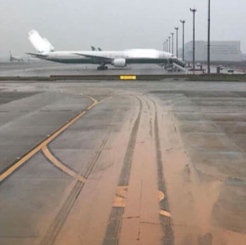 飛機準備起飛瞬間泥濘四起,地面濕滑看來十分危險,陳學聖10號在臉書分享,標題為「網友傳來第一現場目睹機場跑道」桃園議員王浩宇隔空嗆「這是舊照」。