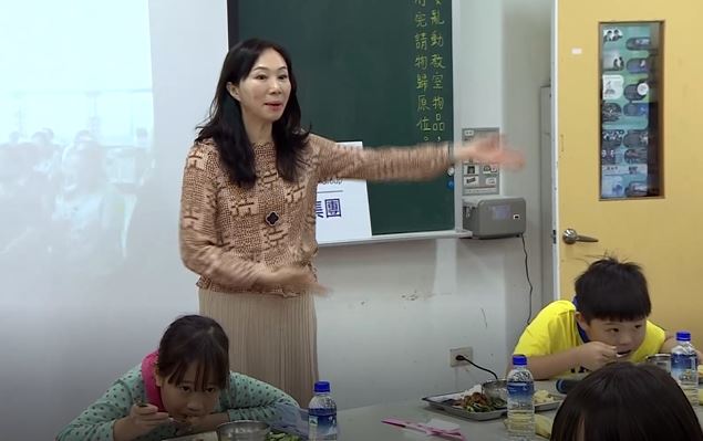 高雄市長夫人李佳芬來到偏鄉六龜的國小,陪著小朋友共進午餐,李佳芬吃了一半忍不住,就像媽媽一樣的要幫小朋友,調整坐歪的椅子。