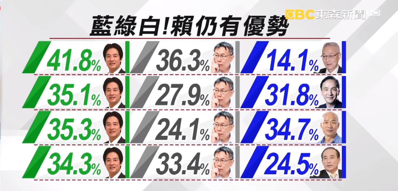 如果賴蔡競爭,賴清德過半支持度,海放蔡英文,而且對決國民黨潛在的4位人選,包含最強的韓國瑜,賴神也全面橫掃,即便加入柯文哲形成三方對決,賴清德仍舊所向無敵。