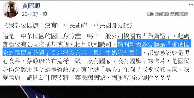 國民黨立委怒嗆,甚至不排除發起公投,國民黨立委黃昭順,更在臉書發文說,身分證上面沒有國旗,就像果汁牛奶沒有果汁,對此內政部長徐國勇再次澄清。