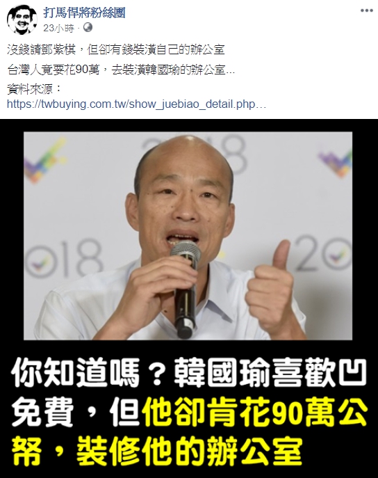 ▼粉絲專頁無奈地說「台灣人竟要花90萬,去裝潢韓國瑜的辦公室」。(圖/翻攝自打馬悍將粉絲團)