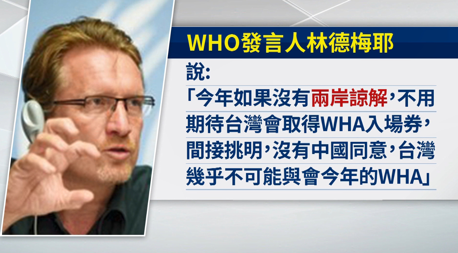 連續2年沒有收到WHA世界衛生大會邀請函,今年這一次恐怕還是拿不入場券,受到中國持續施壓,今年台灣可能3度缺席WHA,根據平面媒體報導,WHO發言人林德梅耶說,今年如果沒有兩岸諒解,不用期待台灣會取得WHA入場券,間接挑明,沒有中國同意,台灣幾乎不可能與會今年的WHA。