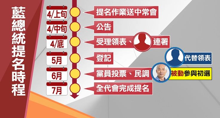表態要參選的予以尊重,目前,國民黨總統提名時程,大致比照2016年模式,4月上旬,相關規定送中常會,月底受理領表。5月登記,6月黨員投票,7月送全代會,完成提名。據了解,黨高層希望,他人代替領表,讓韓國瑜能,被動參與初選。