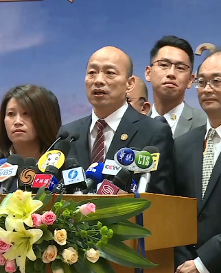 高雄市長韓國瑜:「現在這個兩岸和平協議,根本就不在我現在的考量之內,我前面已經講過2020參選總統,都不在我的考量之內,怎麼會去談這個呢?而且我現在人站在這裡,我們這一群人站在這裡,我們所有的就是把高雄經濟衝起來。」