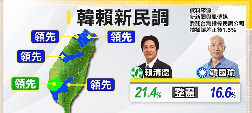 ▼最新民調韓國瑜以21.4%,領先賴清德的16.6%,韓國瑜在六都支持度中就贏了五都。(圖/東森新聞)