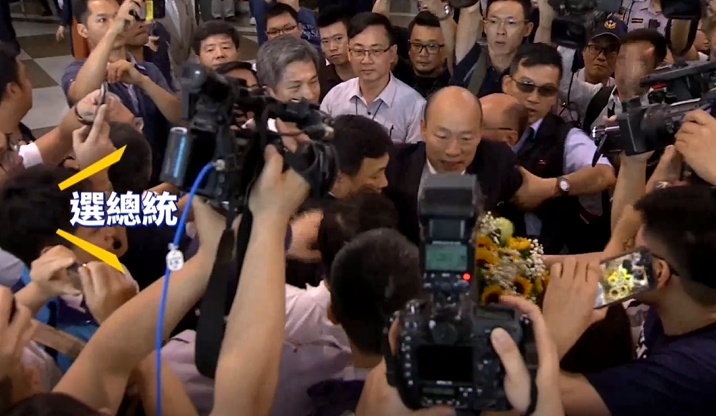 好不容易下來,韓國瑜仍舉高右手轉了270度,回應粉絲,韓國瑜就在韓粉高喊「選總統」的聲浪中,被迅速帶離,儘管現在,就連黨主席吳敦義都開口說要「特邀」他,但韓國瑜仍不表態戰2020。
