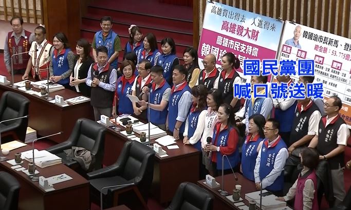 隨後的國民黨團立即以小雞,保護母雞的架勢,給韓國瑜加油打氣。