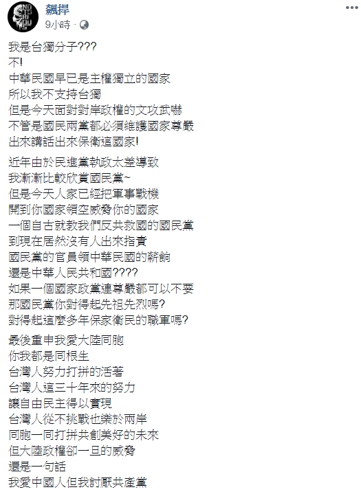 民進黨方面有強烈反應,國民黨相較之下鴉雀無聲,讓館長忍不住在昨(2日)晚間的直播中痛罵國民黨,事後更在臉書Po出一篇322字的文章,開頭就強調自己不支持台獨,而最近民進黨執政表現太差,他開始漸漸欣賞國民黨,但近日共機穿越台海中線,等同於威脅到國家領空,國民黨居然都沒有人跳出來指責,氣的他痛批:「你對得起先祖先烈嗎?對得起這麼多年保家衛民的職軍嗎?」