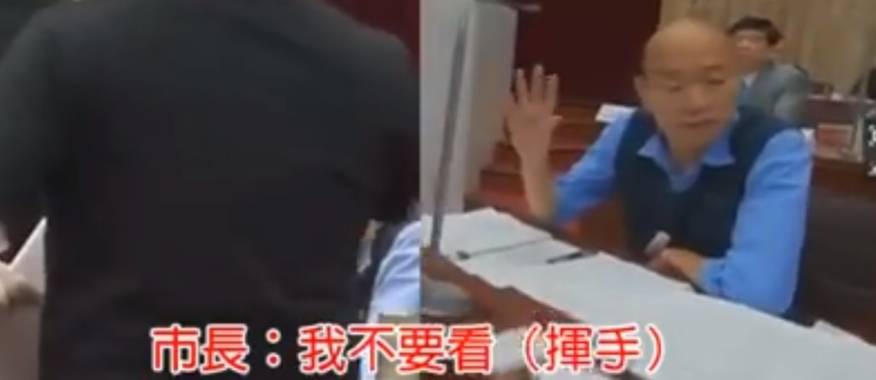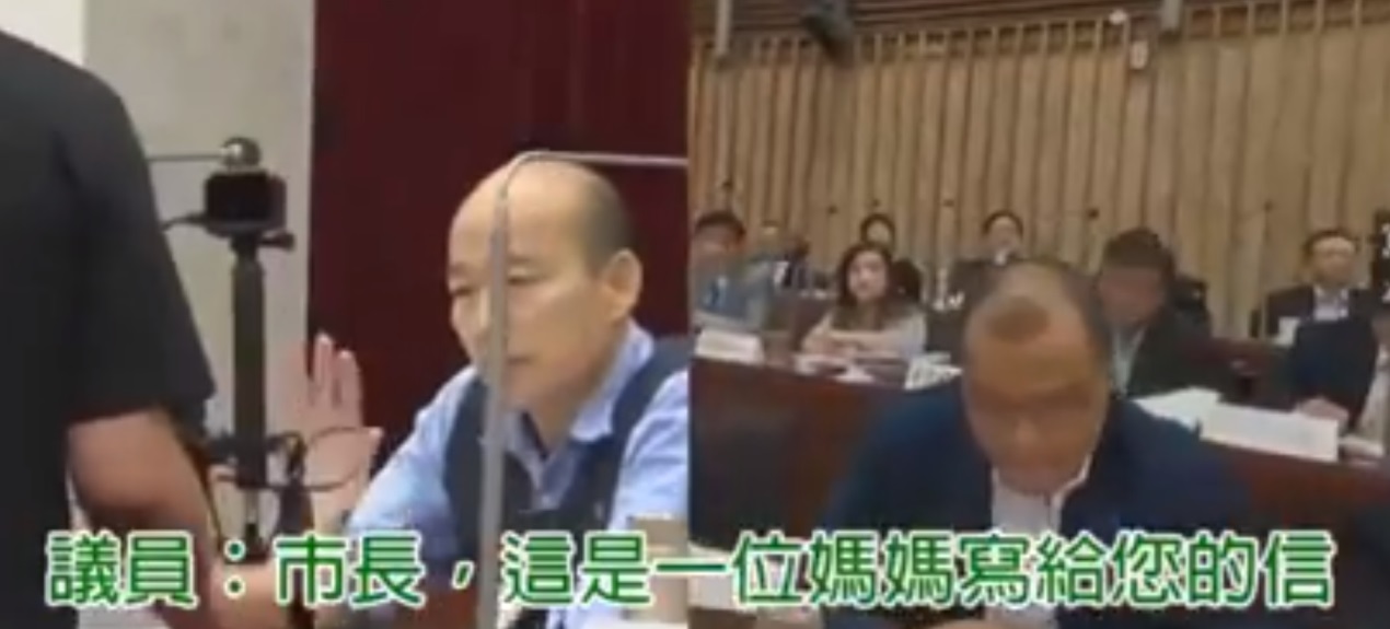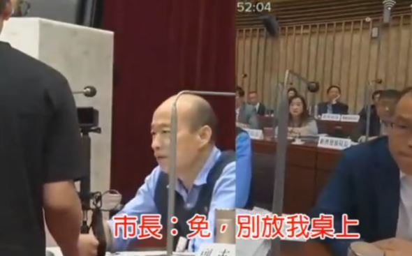 高雄市長韓國瑜日前出訪中國大陸、香港、澳門等地,簽下許多農漁產的合作備忘錄,但也遭許多網友質疑他這樣的行為是在「賣台」。近日網路也流出一段高雄市議會質詢現場的畫面,民進黨議員將一封「兩歲孩媽媽的一封信」交給市長,結果韓國瑜連忙搖手回應「免,別放我桌上」,引發關注。