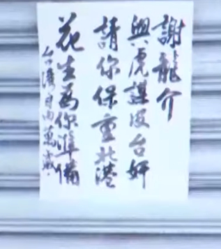 國民黨台南市議員謝龍介自立委補選以來風波不斷,先前有一名吳姓男子離奇倒臥在他的宣傳車上,送醫後不治。昨(4日)又傳出他位於台南的服務處,遭人貼了一張帶有恐嚇意味的告示。告示上寫著,「謝龍介與虎謀皮台奸,請你保重,北港花生為你準備。」謝龍介回憶,在昨天晚間有4、5名男子在服務處前的停車格上舉牌抗議,之後就留下這張字條,目前已經報案,希望警方追查。
