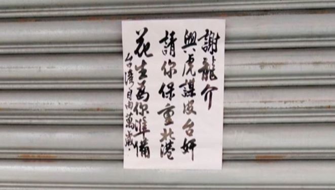 ▼四月二號晚間,60歲葉姓男子到謝龍介服務處前,張貼恐嚇字條。(圖/東森新聞)