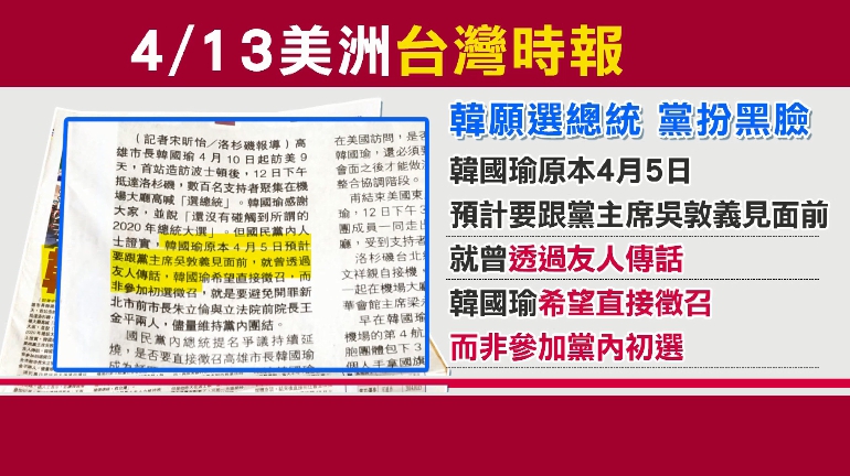 ▼13日當地的台灣時報,斗大標題就寫著韓願選總統(圖/東森新聞)