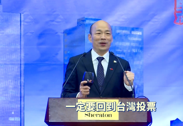 高雄市長韓國瑜:「明年1月11日要拜託大家,把身體健康維護下來,一定要回到台灣投票,我們來捍衛中華民國,這一杯酒拜託大家,身體健康,明年1月11日台灣見。」