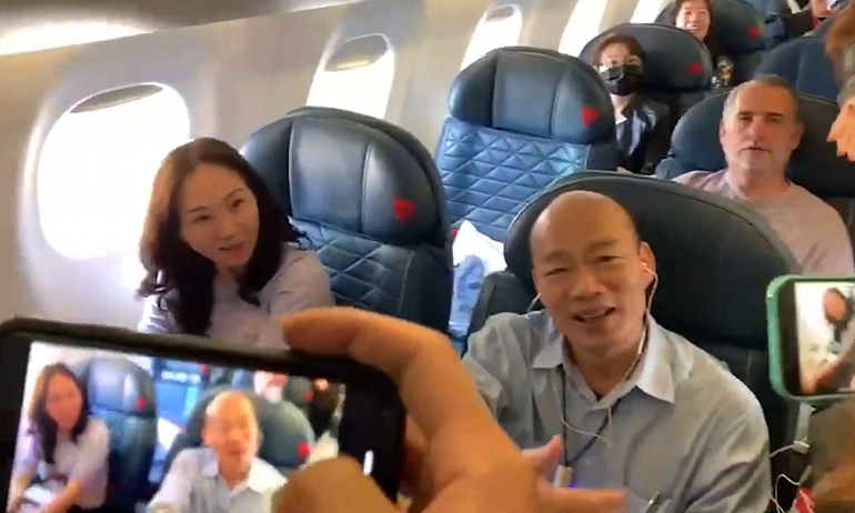 飛機上第一排坐著韓國瑜夫婦,媒體為了搶拍韓國瑜,把走道擠得水洩不通,韓國瑜訪美總是鎂光燈焦點,就連搭飛機的過程也不例外,而在飛機上空服員也特地公開歡迎韓國瑜。