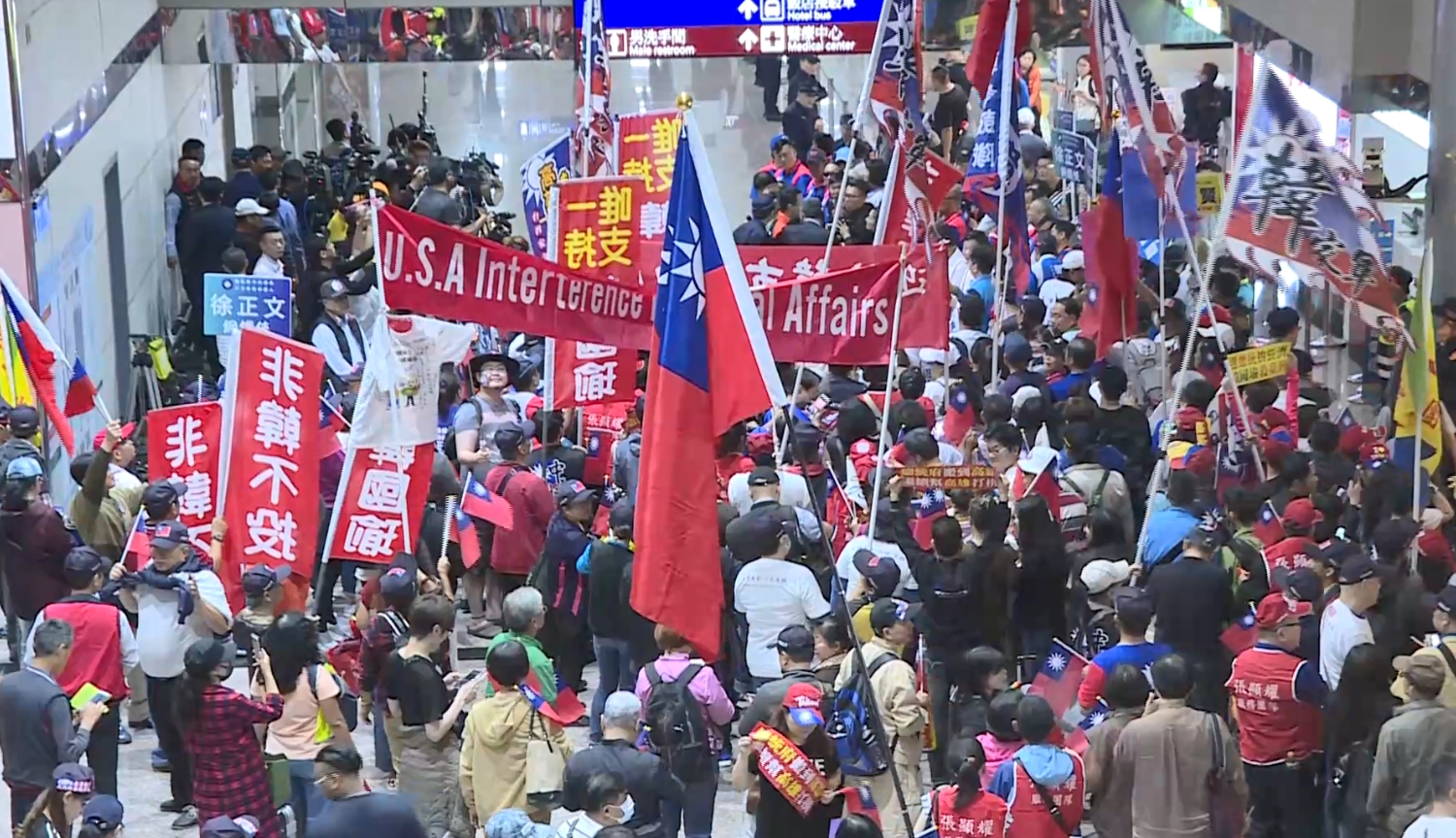 ▼韓粉一早就在桃園機場接機,高喊「韓國瑜選總統」。(圖/東森新聞)