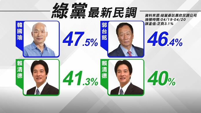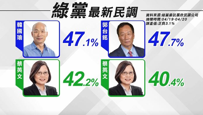 2020總統大選,到底誰的勝算最高,綠黨22日公布,堪稱台灣史上第一次,100%的純手機抽樣民調,採取不提示選項,直接詢問約1000位成年民眾,發現如果是蔡韓對戰,韓國瑜以47.1%支持度,領先蔡英文的42.2%,雙方差距約5.1個百分點,而如果國民黨,是郭台銘代表參選,他將以47.7%領先,蔡英文的40.4%。
