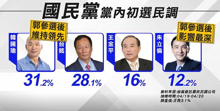 至於國民黨黨內初選部分,這份民調主動提示韓、郭、朱、王4個人選,其中韓國瑜有31.2%支持度,郭台銘有超過28%,王金平16.6%,只有12.2%的民眾,選擇了朱立倫,相較於上一次的綠黨民調,這次郭台銘參選後,韓國瑜還是維持一定領先,目前還是國民黨初選,最有利競爭者,而新北市長朱立倫則吊車尾,受郭台銘參選影響最劇烈。