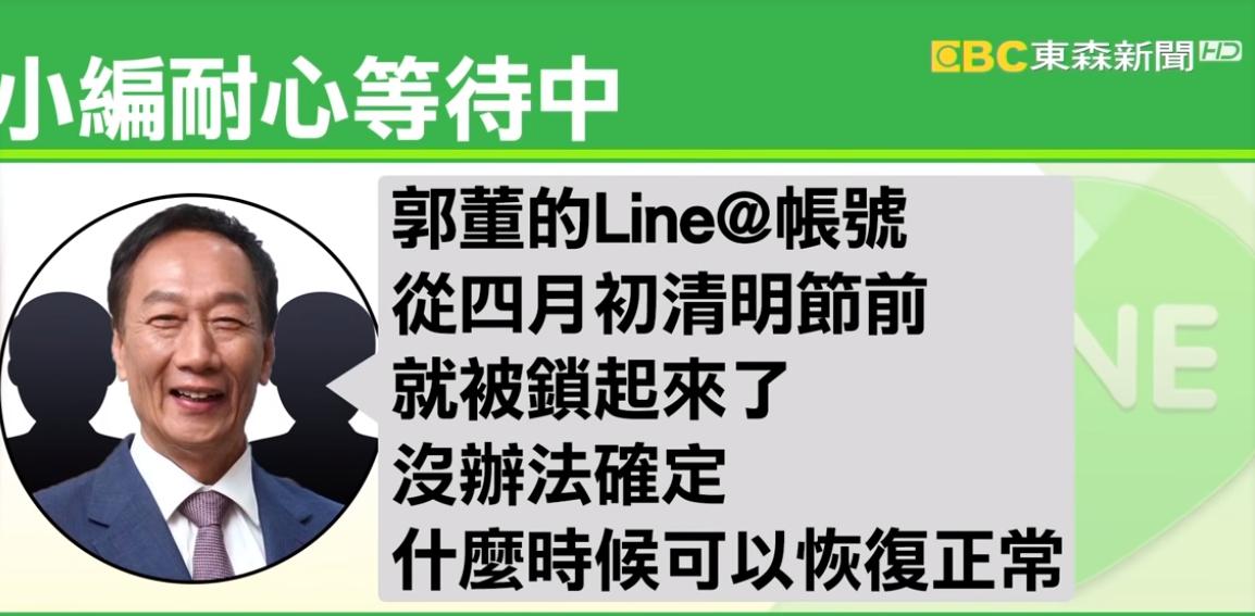 東森新聞記者劉家耀:「郭台銘的LINE@帳號,遇到非常尷尬的狀況,小編說他們不能主動發訊息,所以粉絲只能透過下面這個郭董說什麼,來得知最新的消息。」