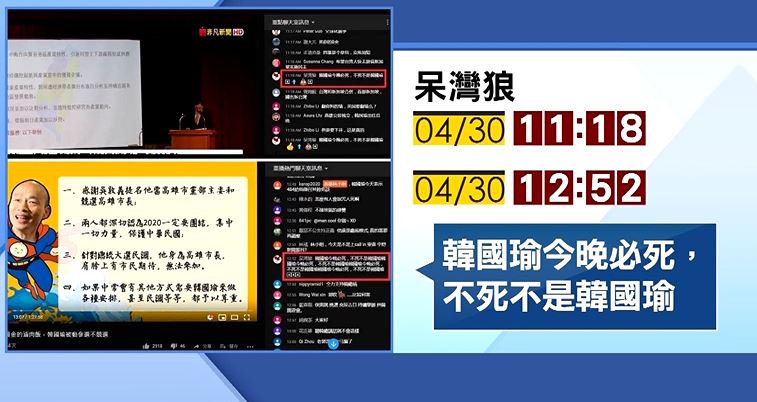 ▼匿稱呆灣狼的網友,留言「韓國瑜今晚必死,不死不是韓國瑜」。(圖/東森新聞)