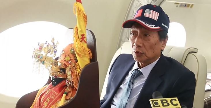美國特派員王一如:「我人現在就在,鴻海董事長郭台銘的專機上,我們可以看到郭董事長,他的懷裡抱了一座媽祖,這是預定他要,帶到威州的廠房工廠去安神,要來保護廠房和他的員工。」